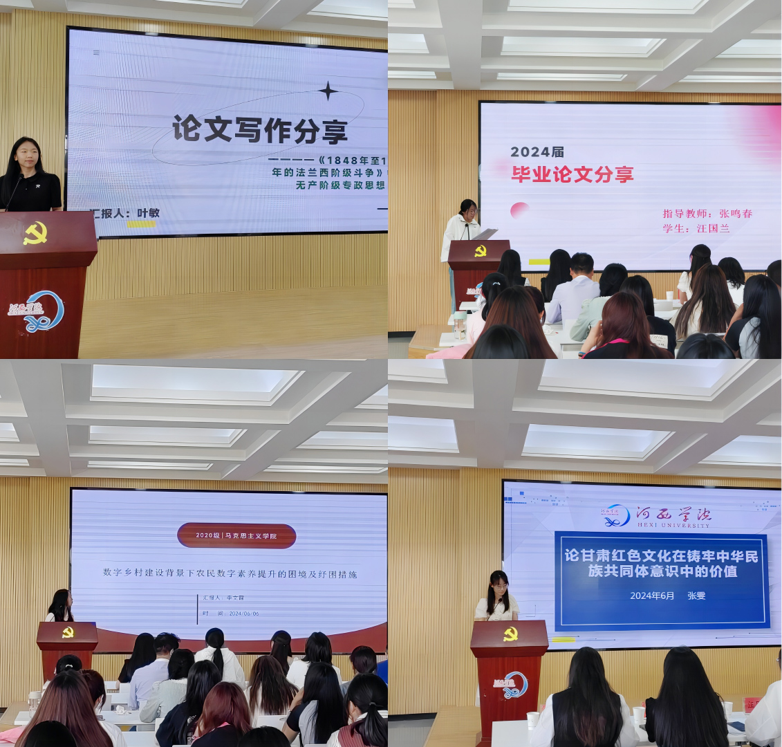 本次汇报会由2024届毕业论文院级答辩中获得优秀等级的叶敏、汪国兰、李文霞、张雯四位同学做汇报交流,她们分别以《<1848年至1850年的法兰西阶级斗争>中的无产阶级专政思想》《乡村文化振兴视域下繁荣发展乡村文化的路径探析--以甘肃省临夏州为例》《数字乡村建设背景下农民数字素养提升困境及纾困措施》《论甘肃红色文化在铸牢中华民族共同体意识中的价值》为题,通过图文并茂的展示方式,阐述了论文研究背景、主要内容、基本方法以及创新之处,同时分享了自己在论文写作过程中遇到的挑战和收获。