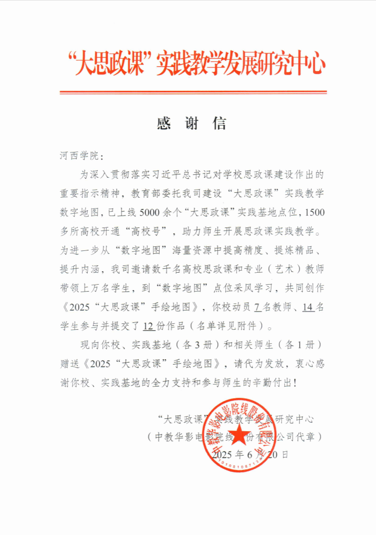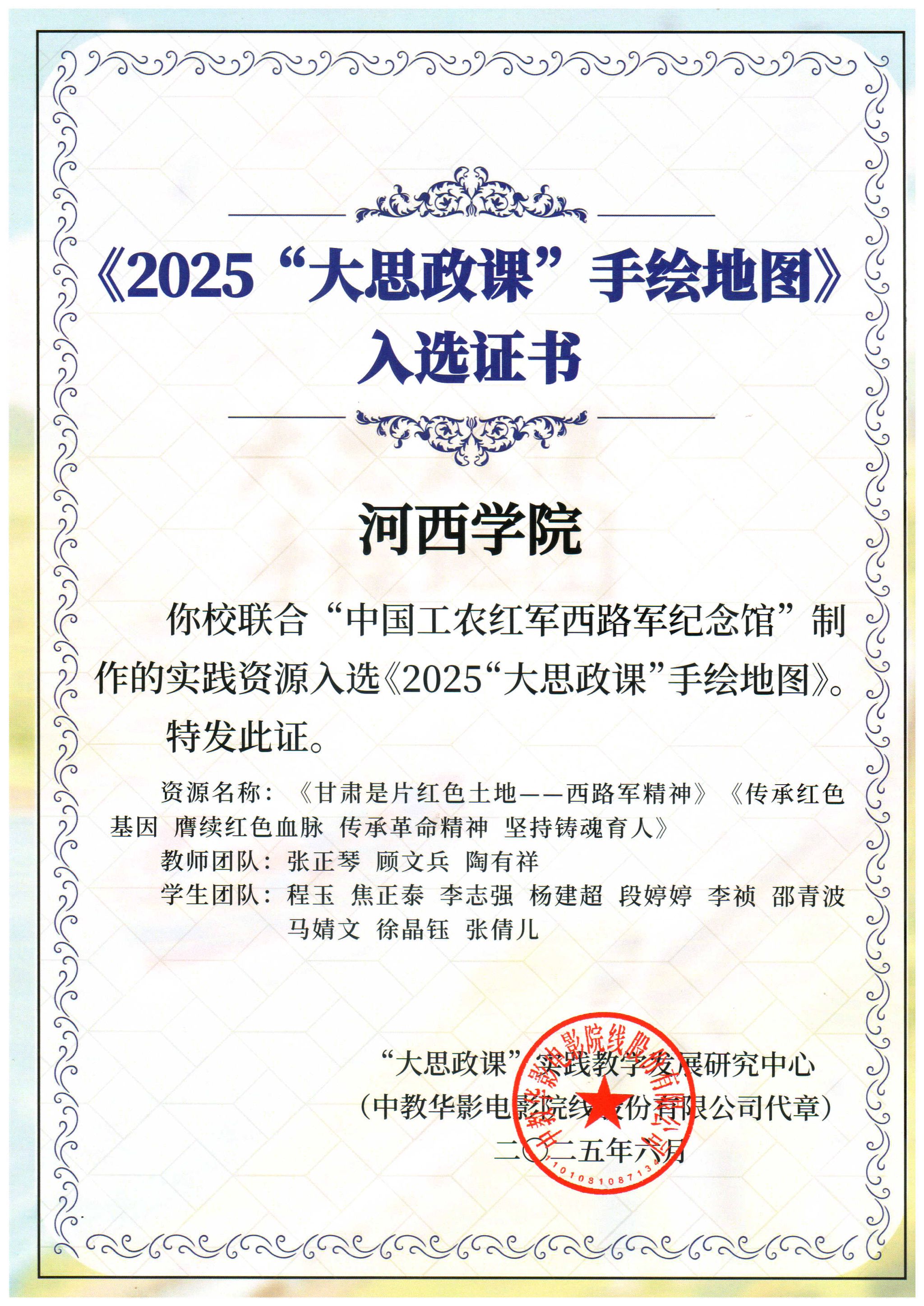 近日,教育部“大思政课”实践教学资源项目评选结果公示,公司betway西汉姆联平台申报的两项实践教学资源成功入选《2025“大思政课”手绘地图》。其中,《甘肃省是片红色热土—西路军精神》《传承红色基因 赓续红色血脉 传承革命精神 坚持铸魂育人》由教师张正琴、顾文兵、陶有祥指导,公司2021、2022、2023级员工共同参与完成。