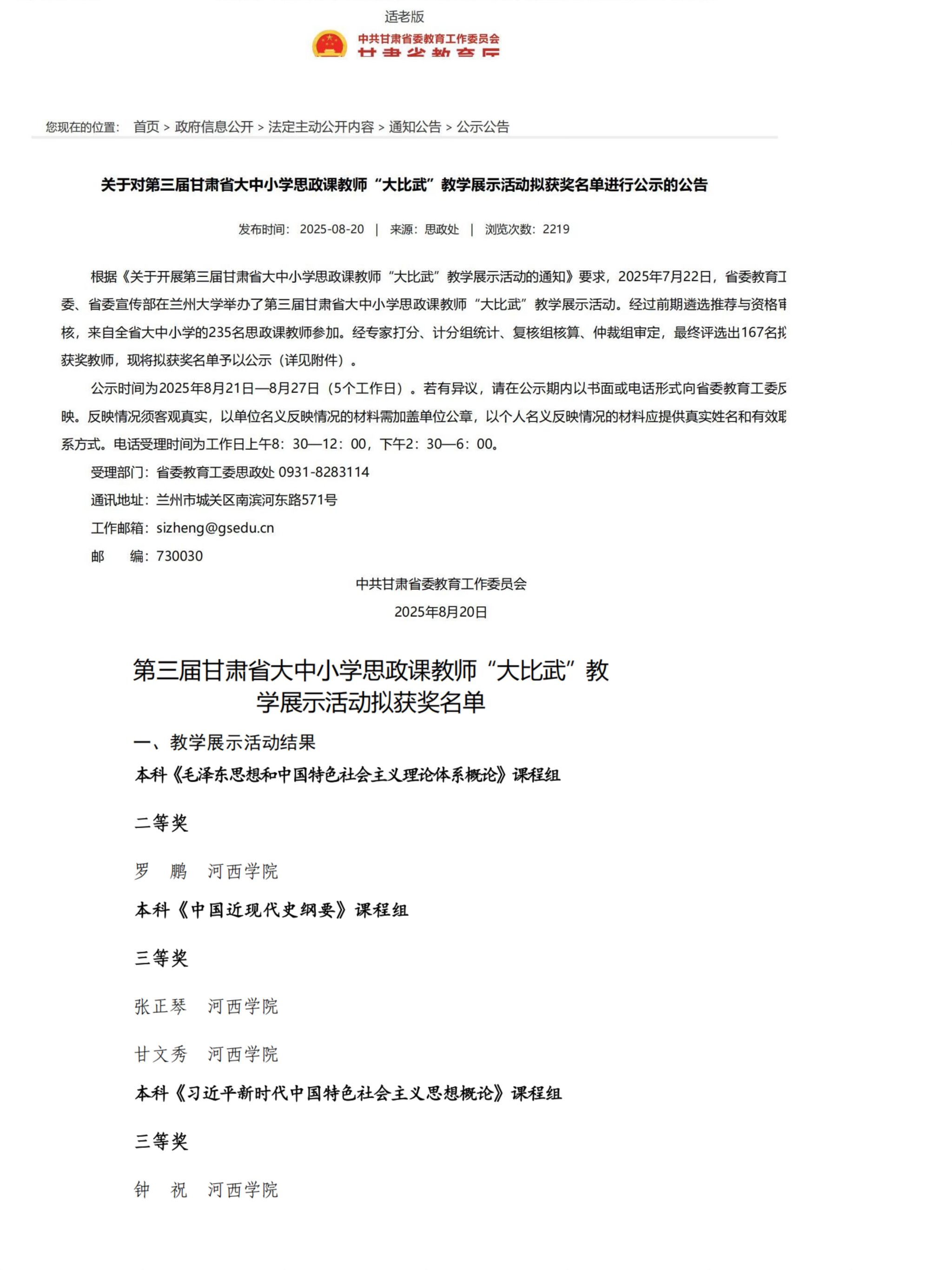 第三届甘肃省大中小学思政课教师“大比武”教学展示活动由甘肃省委宣传部、省委教育工委联合主办,以党的二十届三中全会精神为指导,旨在推动思政课教学改革,提升教师教学能力,增强思政课的实效性。活动吸引了来自全省大中小学的235名优秀思政课教师同台竞技,通过教学设计、课堂展示等环节,全面考察教师的教学能力和专业素养。经过激烈角逐,张正琴、甘文秀老师荣获本科《中国近现代史纲要》课程组三等奖,钟祝老师获得本科《习近平新时代中国特色社会主义思想概论》课程组三等奖。