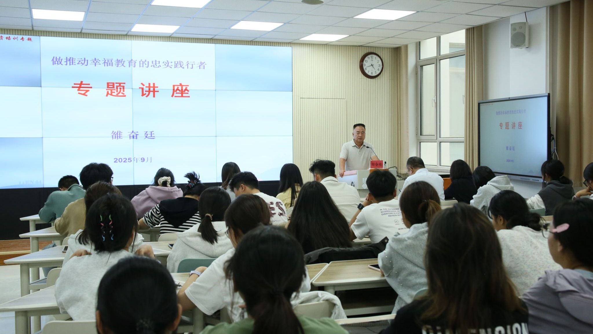 报告围绕“做幸福教育的忠实践行者”,从教师教育思想和理念的重要性、重温教育的本质、幸福教育是什么、教师保持持续幸福状态的重要性和幸福教育视域下的教育实践等方面展开阐述。报告指出,新时代推动和践行“幸福教育”正当其时,公司及教师应该为实现“幸福教育”培育“幸福员工”而不懈奋斗,只要做到守正固本,促进人的全面、生态、可持续发展就能不断适应社会发展和员工成长需要。